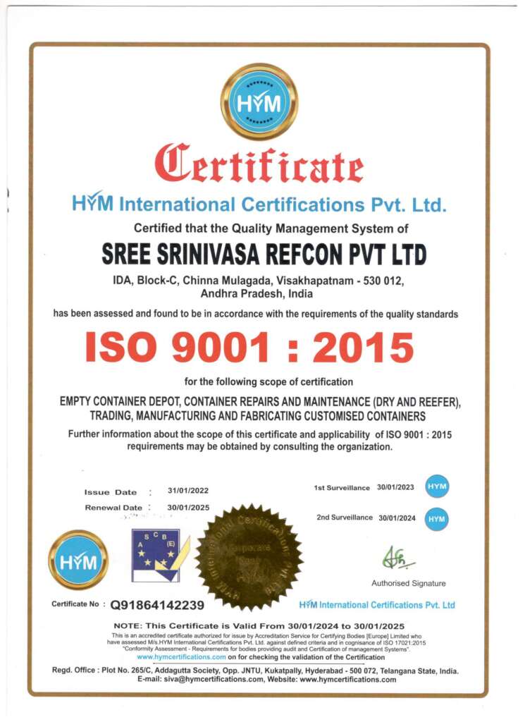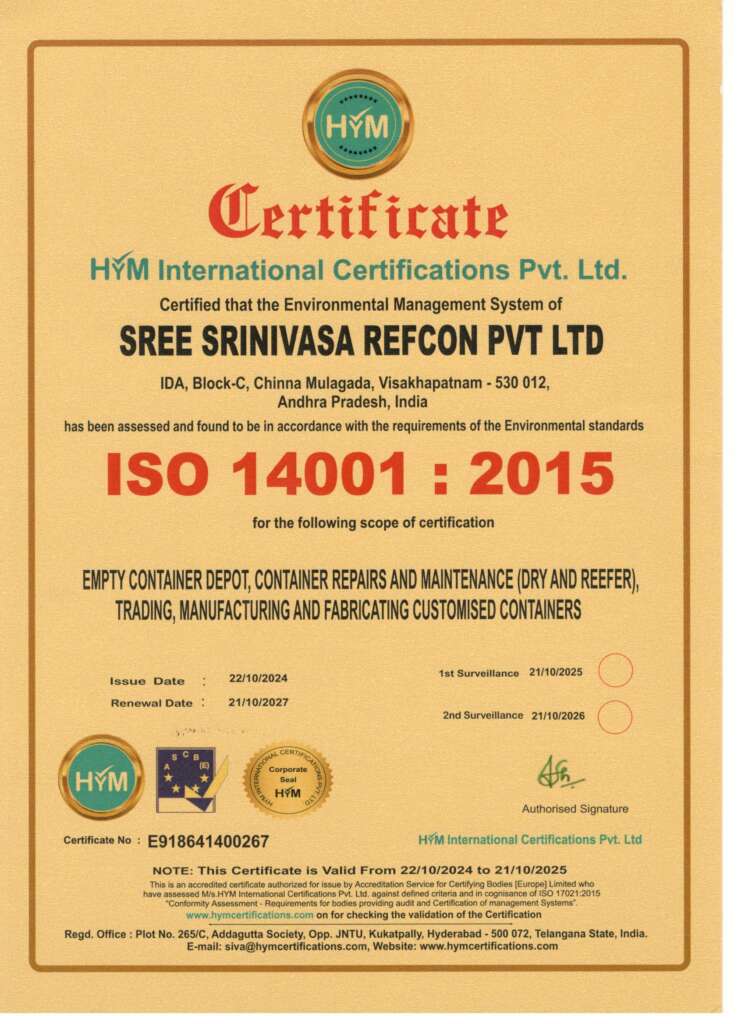 Sree Srinivasa Refcon Pvt. Ltd. is certified to ISO 9001:2015 (Quality Management System) and ISO 14001:2015 (Environmental Management System) by HYM International Certifications Pvt. Ltd.