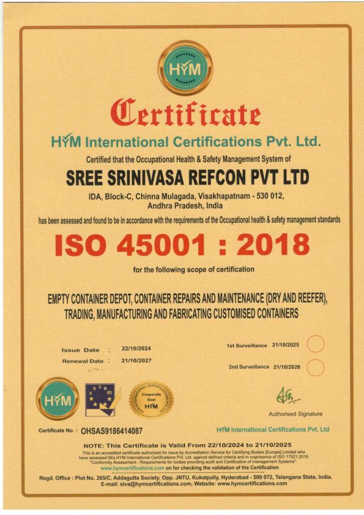 These certifications cover our core operations in empty container depot services, container repairs & maintenance (dry and reefer), trading, manufacturing, and fabrication of customised containers at our facility in Visakhapatnam, Andhra Pradesh.
